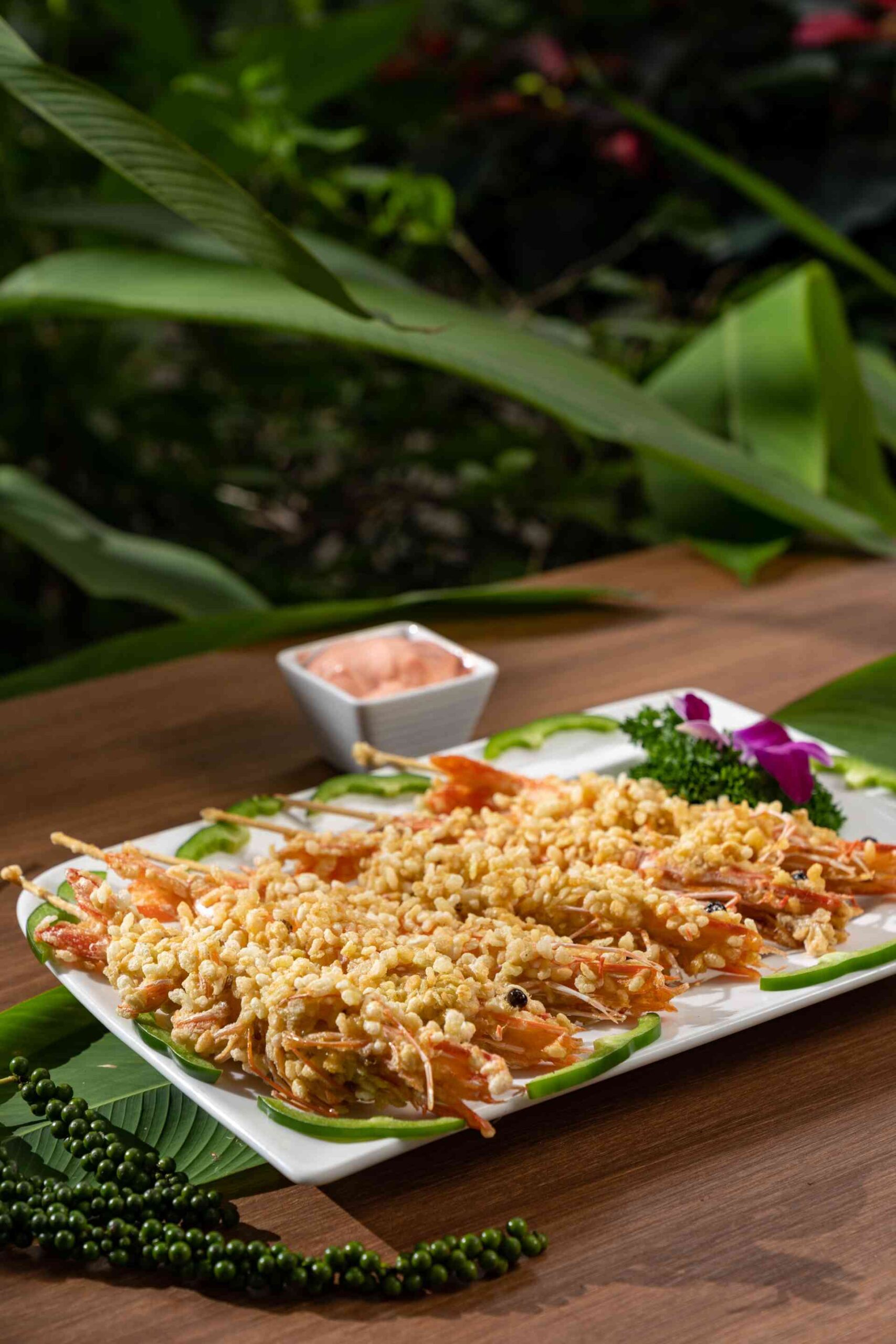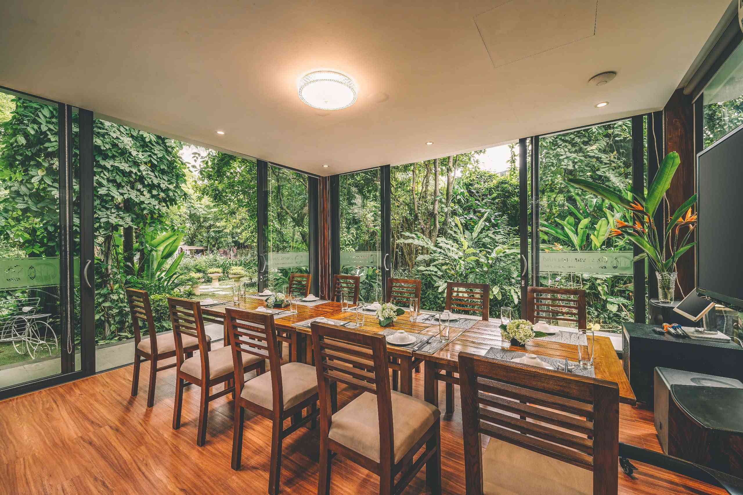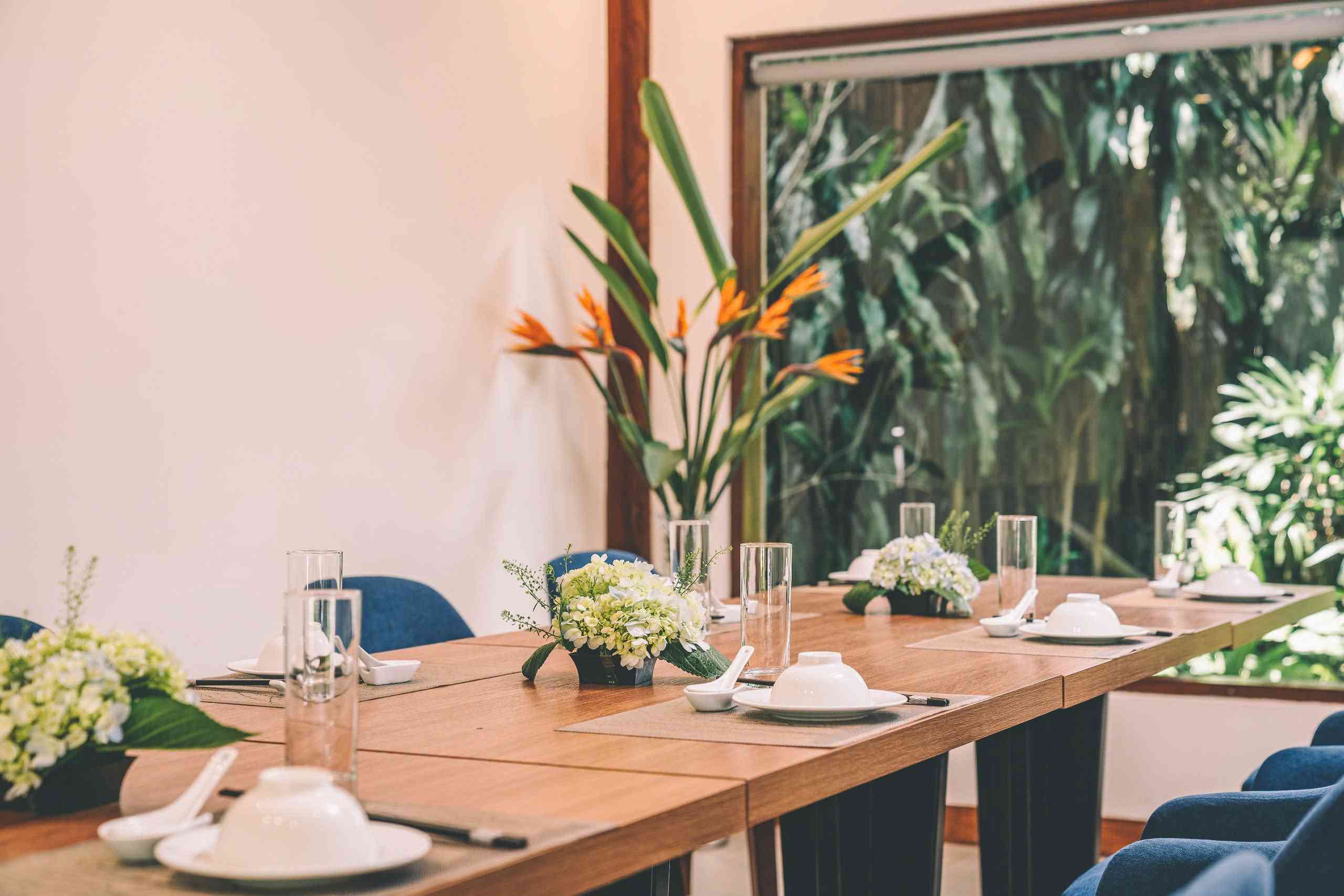 Với ánh nâu trầm của gỗ và sắc xanh dịu của thiên nhiên được đưa vào gần hơn qua những bức tường kính trong suốt, phòng tiệc Đỗ Quyên mở ra không gian khoáng đạt, thư thái.